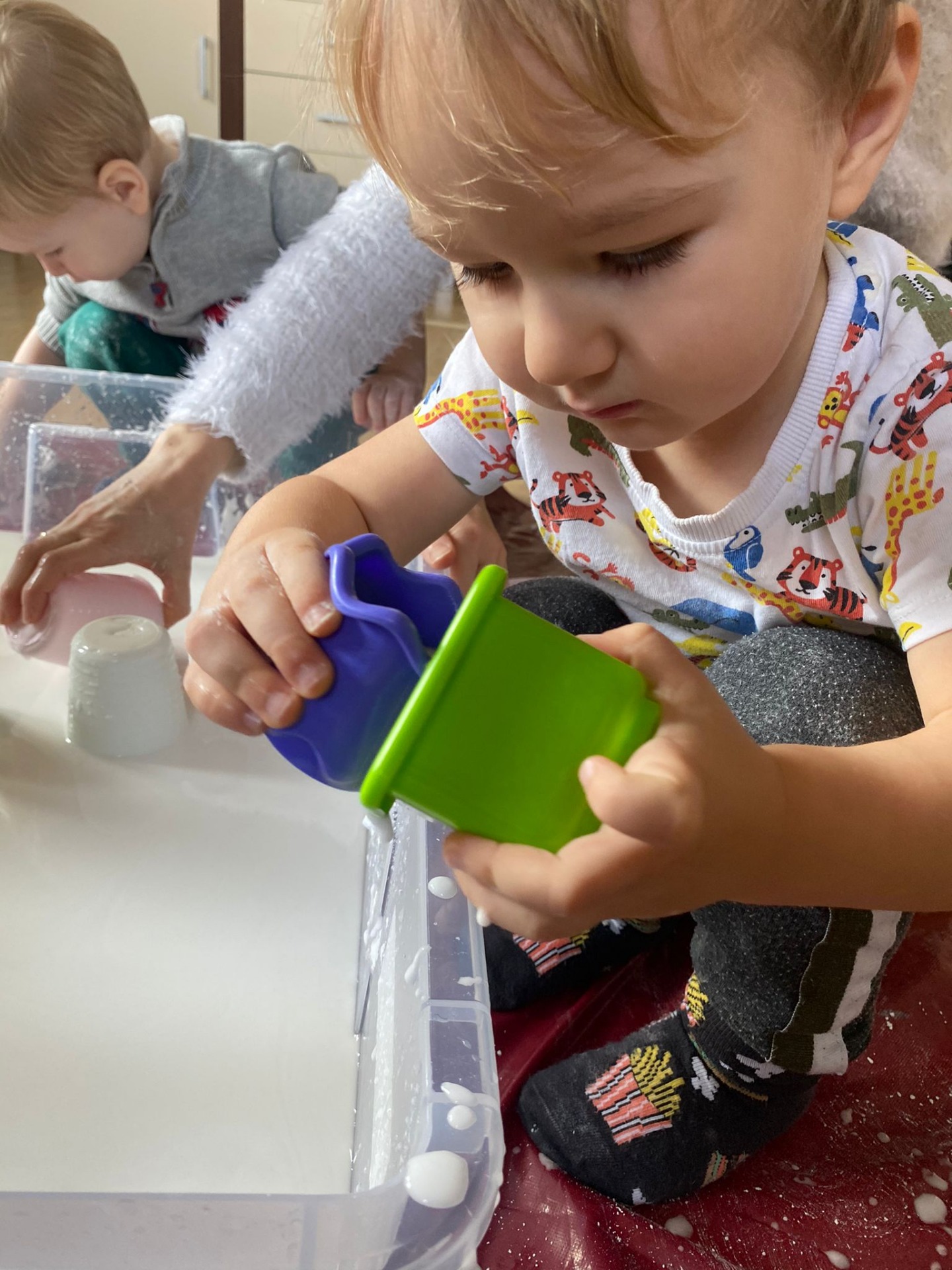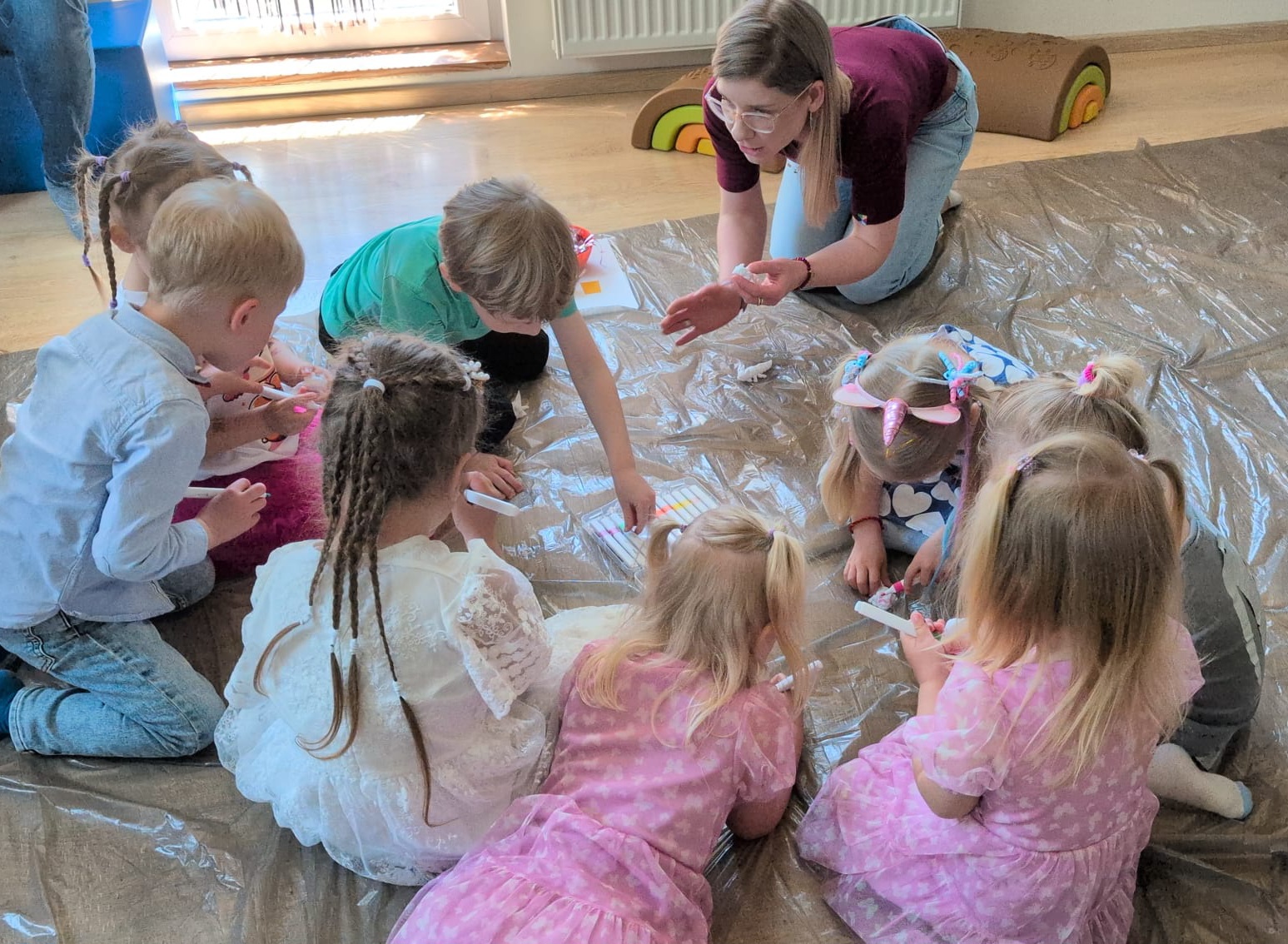 Podczas spotkań każde dziecko wraz z rodzicem/opiekunem mają czas na doświadczanie we własnym tempie oraz na własny sposób.
